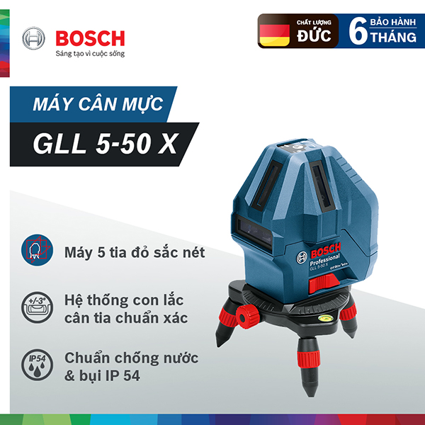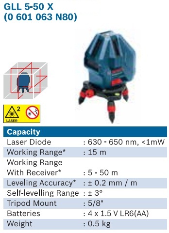 این دستگاه دارای ۵ خط لیزری با طول موج ۵۳۰ نانومتر است که دقت بالایی در تولید خطوط لیزری با ضخامت ۸۰ درصد دارد. دستگاه GLL 5-50 X PROFESSIONAL به وسیله یک دستگاه رادار نیز مجهز شده است که اندازه و فاصله بین دو نقطه را با دقت بالا اندازهگیری میکند.