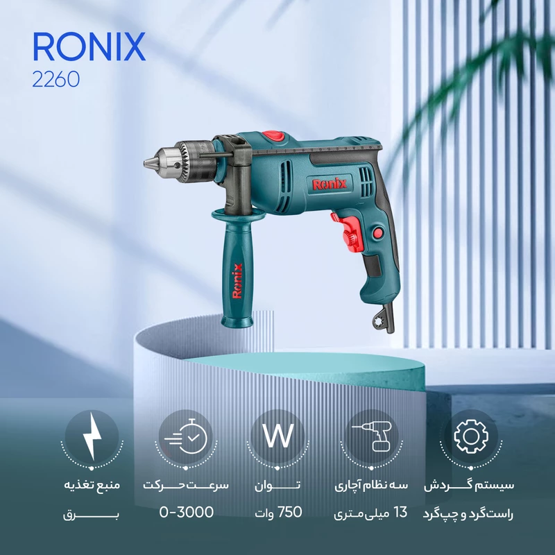 دریل برقی چکشی 2260 رونیکس، کارایی و عملکرد فوقالعاده بالایی را در دو حالت سوراخکاری معمولی و چکشی از خود نشان میدهد. موتور قدرتمند 750 وات در این دریل، از آرمیچر و بالشتکهای باکیفیت تشکیل شده و قادر است سه نظام آچاری و 13 میلیمتری این ابزار را با سرعتی بالغ بر 3000 دور در دقیقه به حرکت در آورد. افزونبراین، به راحتی میتوانید سرعت دستگاه را با استفاده از دیمر روی کلید پاور، کنترل کنید. کافی است تا هنگام سوراخکاری مصالح ساختمانی و متراکم همچون بتن و سرامیک، دستگاه را برای سرعتبخشیدن به کار، روی حالت چکشی قرار دهید تا سیستم ضربهزنی پشت مته فعال شود. به علاوه، دستهی جانبی ضد لرزش، با چرخش 360 خود، استفاده از دریل را در جهات مختلف برای کاربر امکانپذیر میکند.