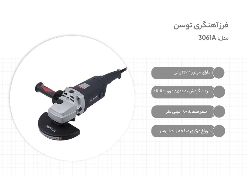 دستگاه فرز مدل 3061A محصولی است که در اصطلاح عمل برش و ساب را روی اجسام مختلف انجام میدهد. این دستگاه موتور قدرتمندی دارد و برای بهکارگیری آن باید از صفحهی فرز با قطر مشخص استفاده کرد. ابعاد و وزن این دستگاه مناسب و مطابق با دستگاههای فرز بزرگ در نظر گرفتهشده است. دستگاه فرز مدل 3061A را شرکت «توسن» (Tosan) تولید و به بازار معرفی کرد. این شرکت ازجملهی تولیدکنندگان داخلی ابزار و لوازم جانبی آن است. بارزترین ویژگی محصولات این شرکت قیمت مناسبتر نسبت به محصولات مشابه سایر شرکتهای تولیدکننده است. این محصول شرکت توسن به یک موتور 2200 واتی مجهز شده که حداکثر سرعت گردش آن به 8500 دوربردقیقه میرسد. این موتور، صفحهی فرز را هم با همین سرعت به گردش درمیآورد. برای استفاده از این دستگاه باید صفحهی فرزهای برش یا ساب با قطر 180 میلیمتر را تهیه کنید. ضمنا قطر سوراخ مرکزی صفحه نیز باید 14 میلیمتر باشد. این محصول دارای ابعاد 11 × 12 × 45 سانتیمتر است. همچنین وزن این دستگاه 5.4 کیلوگرم است. این ابعاد و وزن متناسب با کارایی و نوع فرز طراحیشده است. در کارتن این محصول، علا.ه بر دستگاه، یک محافظ صفحه و یک دستهی کمکی هم قرار دادهشده است. از دستگاههای فرز برای بریدن یا سنباده کردن اجسام مختلف بهویژه فلزات و سنگهای ساختمانی استفاده میکنند. البته بسته به نوع مصرف و نوع جسم موردنظر، باید صفحهِی فرز مخصوص به آن را تهیه کنید. استفاده از دستگاههای فرز، کاری است که باید با احتیاط بالایی انجام شود. در زمان استفاده از دستگاه، بهتر است که محافظ صفحه، روی دستگاه بسته شود. باید توجه کنید که نباید بههیچوجهی با یک دست از این دستگاه استفاده کنید. مدل 3061A ازجملهی دستگاههای فرز قدرتمند است که موتور آن با قدرت 2200 وات کار کرده و با سرعت 8500 دوربردقیقه گردش میکند.