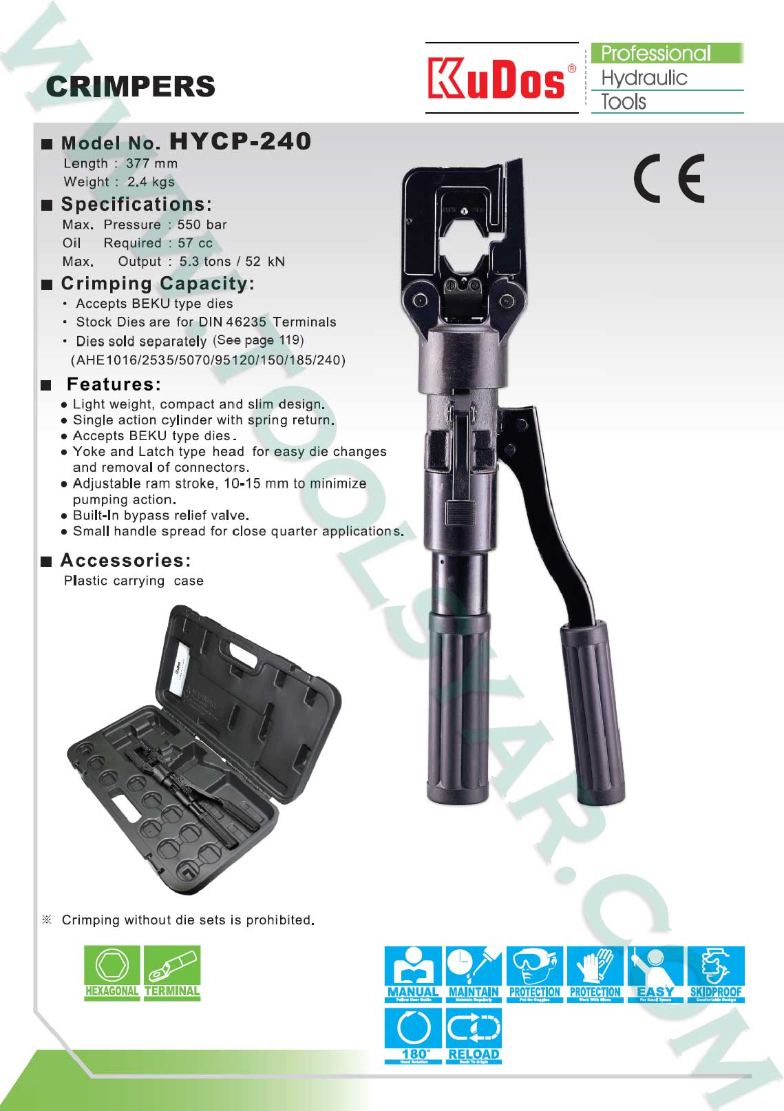 پرس کابلشو KUDOS مدل HYCP-240 با 5.3 تن مناسب برای لقمه کلگی های BEKU سایز 10 الی 240 میلیمتر مربع ساخت تایوان است . بدنه سبک و طراحی باریک و کامپکت بدنه با پمپ تک سرعته و دسته کوچک با کورس حرکتی کم از مشخصات این پرس کابلشو است .