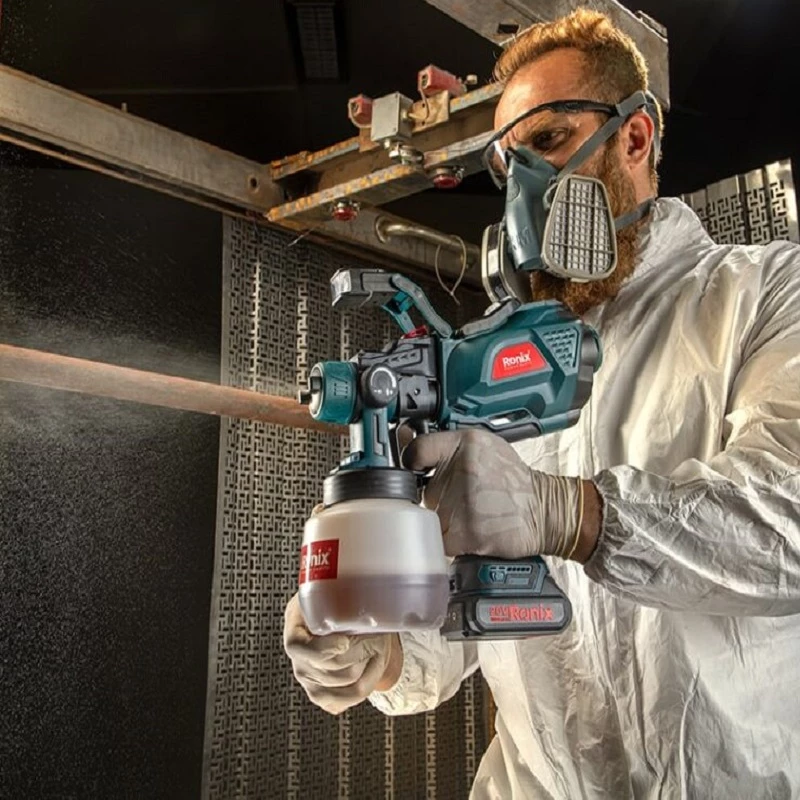 پیستوله رنگپاش شارژی 8604 رونیکس، نسل جدید پیستولههایی است که با مکانیزم حجم بالا- فشار پایین HVLP کار میکند. در این مکانیزم، حجم رنگ زیاد بوده و فشار هوا کم است. بنابراین، ذرات رنگی بیشتری روی سطوح مینشیند و در نتیجه، ضخامت رنگ بیشتر میشود. میتوان با تنظیم نازل از این پیستوله برای رنگکاری و پاشش حرفهای رنگ در جهات مختلف افقی، عمودی و گرد استفاده کرد. یکی از مهمترین مزایای این پیستوله، شارژی بودن آن است؛ چراکه بدون نیاز به سیم، در مکانهای با دسترسی دشوار و برای پاشش رنگ در سطوح وسیع قابل استفاده است. در پیستوله 8604 رونیکس از باتری 20 ولت لیتیوم-یون با ظرفیت 2000 میلیآمپر ساعت استفاده شده است. این باتری در تمام محصولات All In One سری 86 رونیکس قابل استفاده است؛ بین 18 تا 20 دقیقه کار میکند و حداکثر جریان رنگ 600 میلیلیتر در دقیقه را ایجاد میکند.