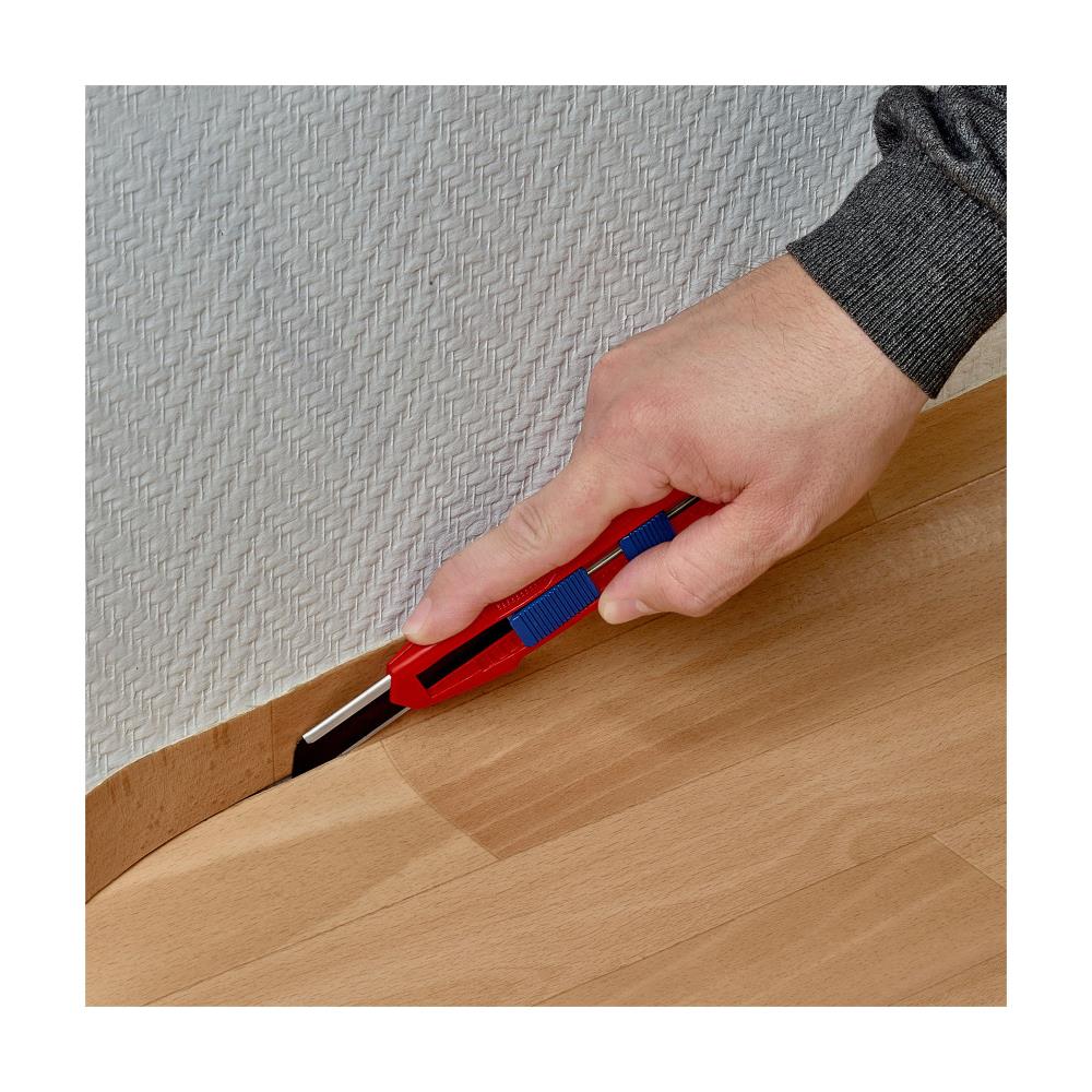 کاتر 9010165BK کنیپکس یک کاتر کاربردی و با کیفیت مناسب برای مصارف عمومی و حرفه ای است. این کاتر 165 میلی متر طول و 111 گرم وزن داشته و به دلیل طراحی خوش دست و ارگونومیکی که دارد به خوبی درون دست قرار گرفته و در حین کار سر نمی خورد. می توان از انواع تیغه های تخت ، موج دار و ... با عرض 18 میلی متر برای این مدل استفاده کرد. در قسمت نگهدارنده تیغه از پین های فولادی سخت و با کیفیت استفاده شده است و به همین دلیل تیغه در هنگام برش دادن ورق های ضخیم نیز از ایستایی و استحکام بالایی برخوردارست.